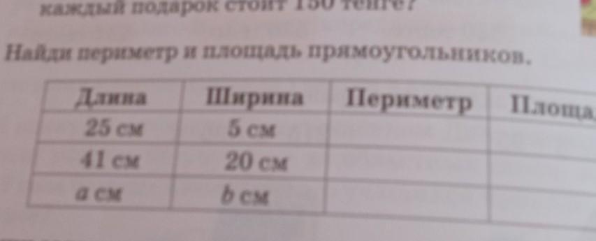 2. Найди периметр и площадь прямоугольников, Ширина Периметр 25 см 5 см 41 см 20 см b см Длина Площадь а см