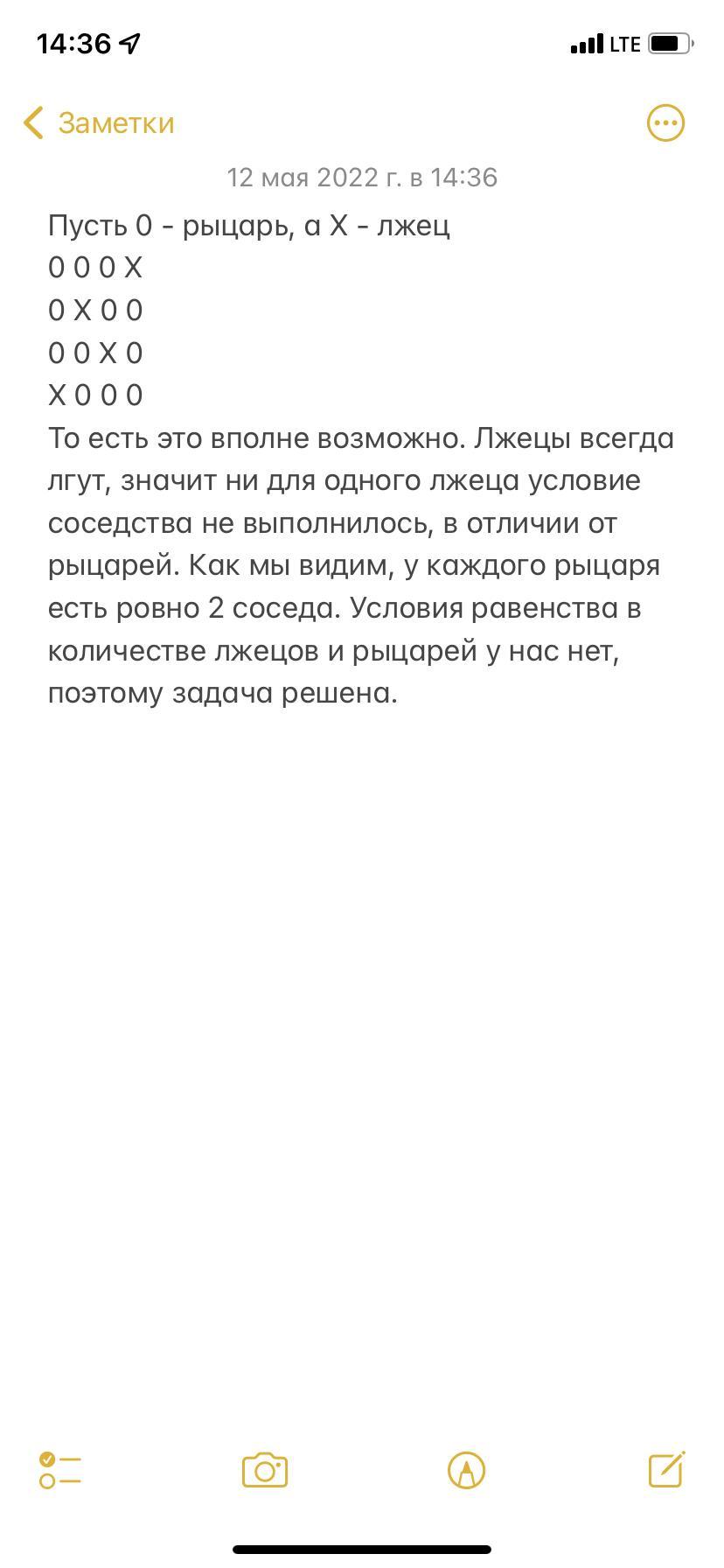 Пусть 0 - рыцарь, а X - лжец0 0 0 X0 X 0 00 0 X 0X 0 0 0То есть это вполне возможно. Лжецы всегда лгут, значит ни для одного лжеца условие соседства не выполнилось, в отличии от рыцарей. Как мы видим, у каждого рыцаря есть ровно 2 соседа. Условия равенства в количестве лжецов и рыцарей у нас нет, поэтому задача решена.