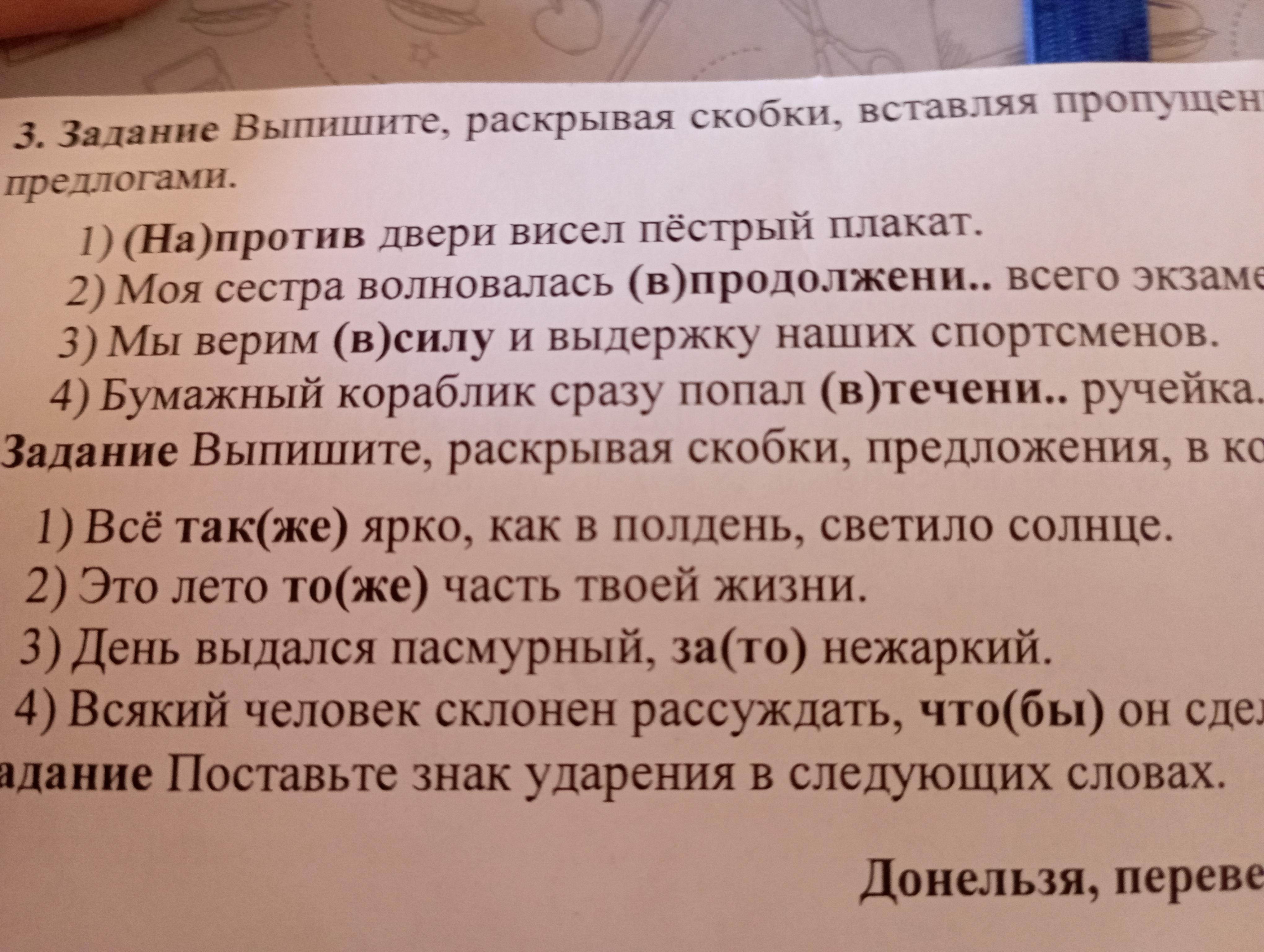 Выписать, раскрывая скобки, вставляя пропущенные буквы, предложения, в которых выделенные слова являются предлогами: