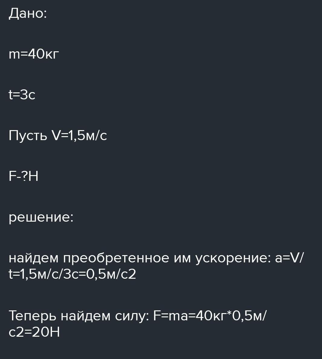 Лыжник массой 40 кг скатывается с горы . При этом за 5 секунд его скорость увеличивается на 0,5м/с до 2,5м/с . Определить равнодействующую всех приложенных к лыжнику сил .