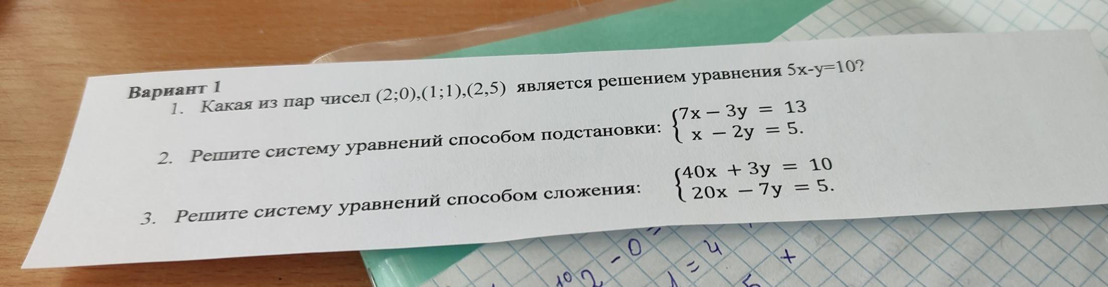 - Вариант 1 1. Какая из пар чисел (2;0),(1;1), (2,5) является решением уравнения 5x-y=10? 2. Решите систему уравнений способом подстановки: (7x — Зу = 13 { x — 2y = 5. = (40x + Зу = 10 20х — 7y = 5. — 3. Решите систему уравнений способом сложения:
