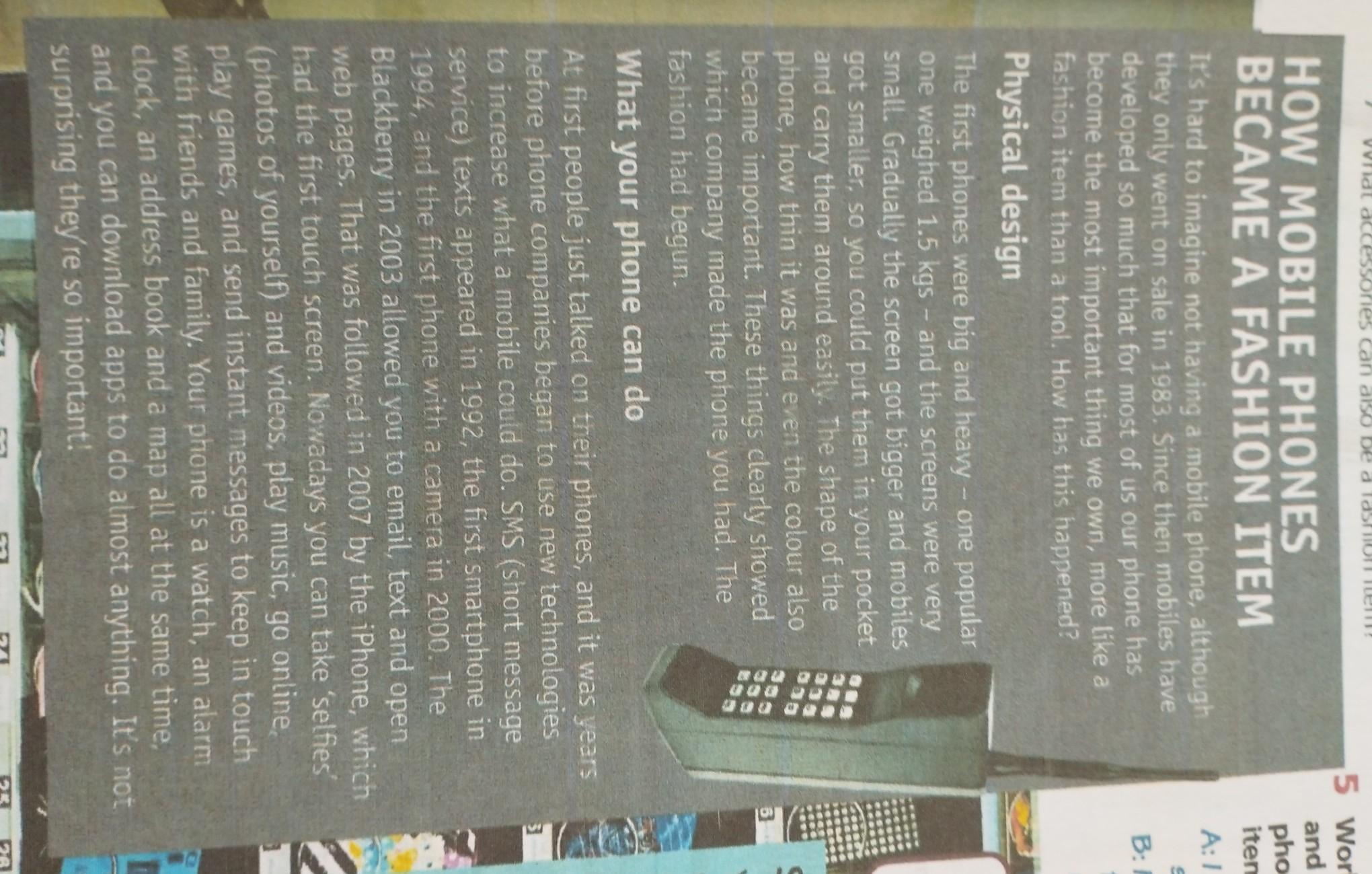 3 Read the article again and answer the questions. 1 What was the problem with the first mobile phones? 2 What helped people to identify the company which made the phone? 3 What could you do with the first mobile phones? 4 Which phone was the first you could use to send emails? 5 How many different uses for mobile phones nowadays are mentioned in the artide? 6 Name one way the artide says that mobile phones are important for social media. 7 What accessories can also be a fashion item?