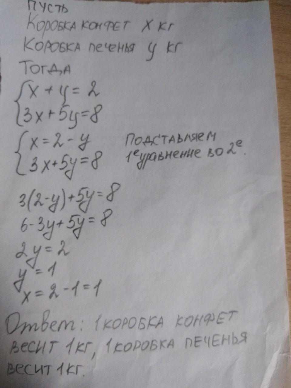 Одна коробка конфет и одна коробка печенья вместе весят 2 кг 3 коробки конфет и 5 коробок печенья вместе весят 8 кг сколько весит коробка конфеты сколько весит коробка печенья