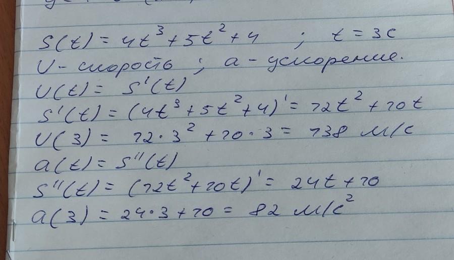Точка движется прямолинейно по закону S(t)=4t^3+5t^2+4 (S-в метрах). Найдите скорость и ускорение при t=3 с.