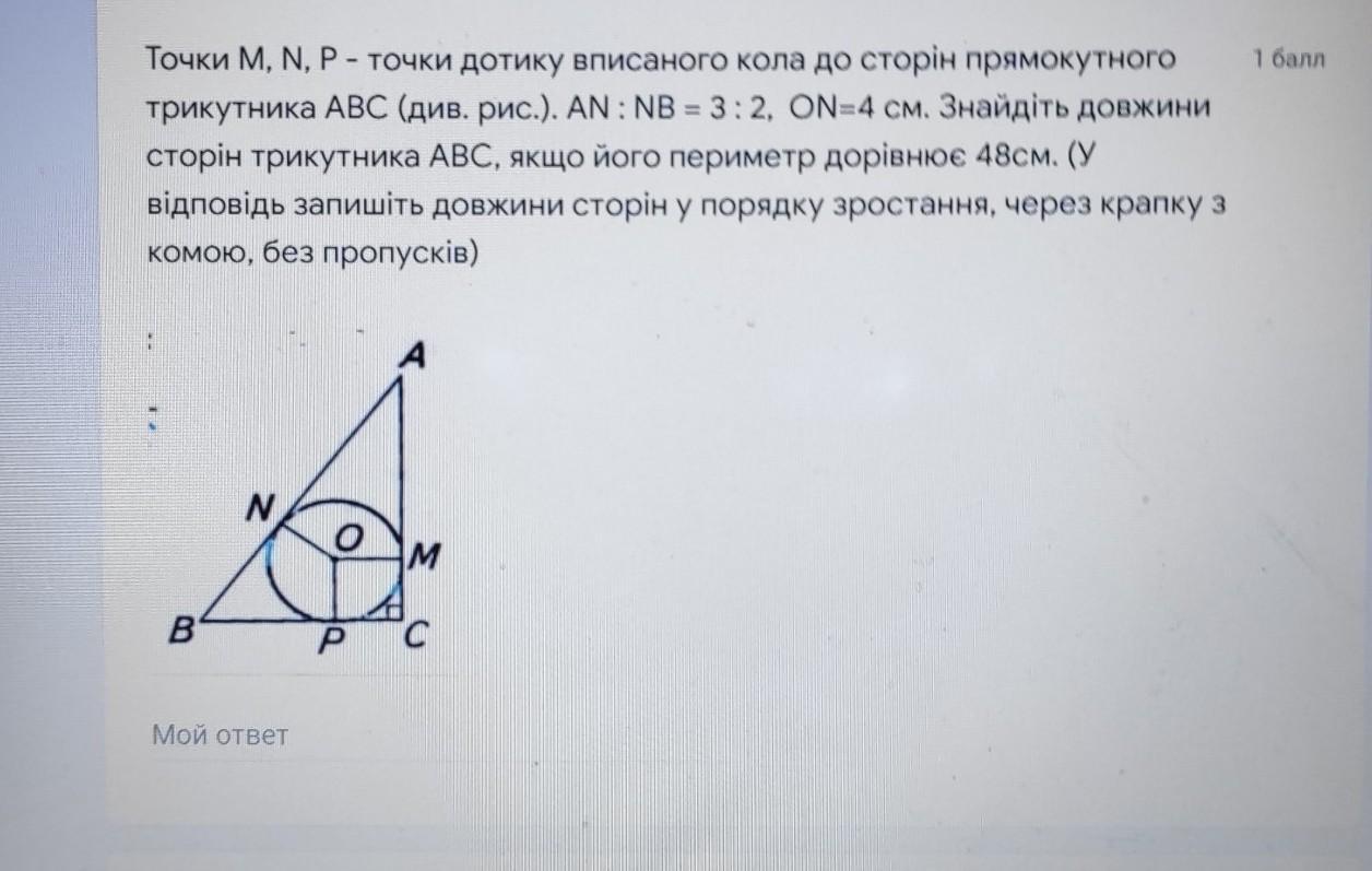 Точки M, N, P - точки дотику вписаного кола до сторін прямокутного трикутника АВС (див. рис.). AN : NB = 3 : 2, ON=4 см. Знайдіть довжини сторін трикутника АВС, якщо його периметр дорівнює 48см. (У відповідь запишіть довжини сторін у порядку зростання, через крапку з комою, без пропусків)