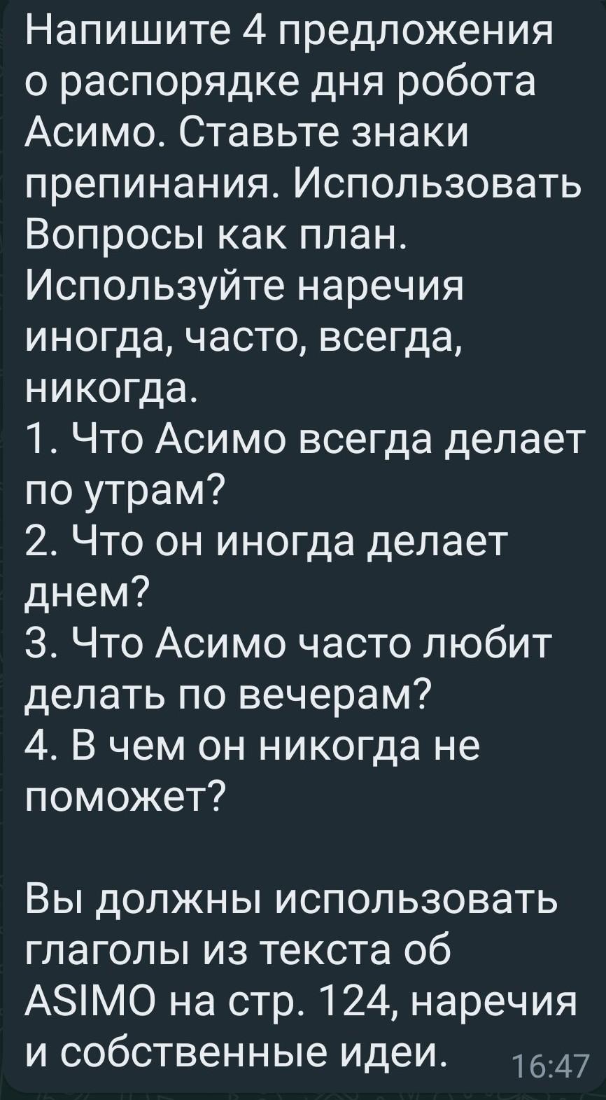 Write 4 sentences about Robot Asimo's daily routine. Put punctuation marks. Use Questions as a plan. Use adverbs sometimes, often, always, never. 1. What does Asimo always do in the morning? 2. What does it sometimes do in the afternoon? 3. What does Asimo often like doing in the evening? What can it never help with?