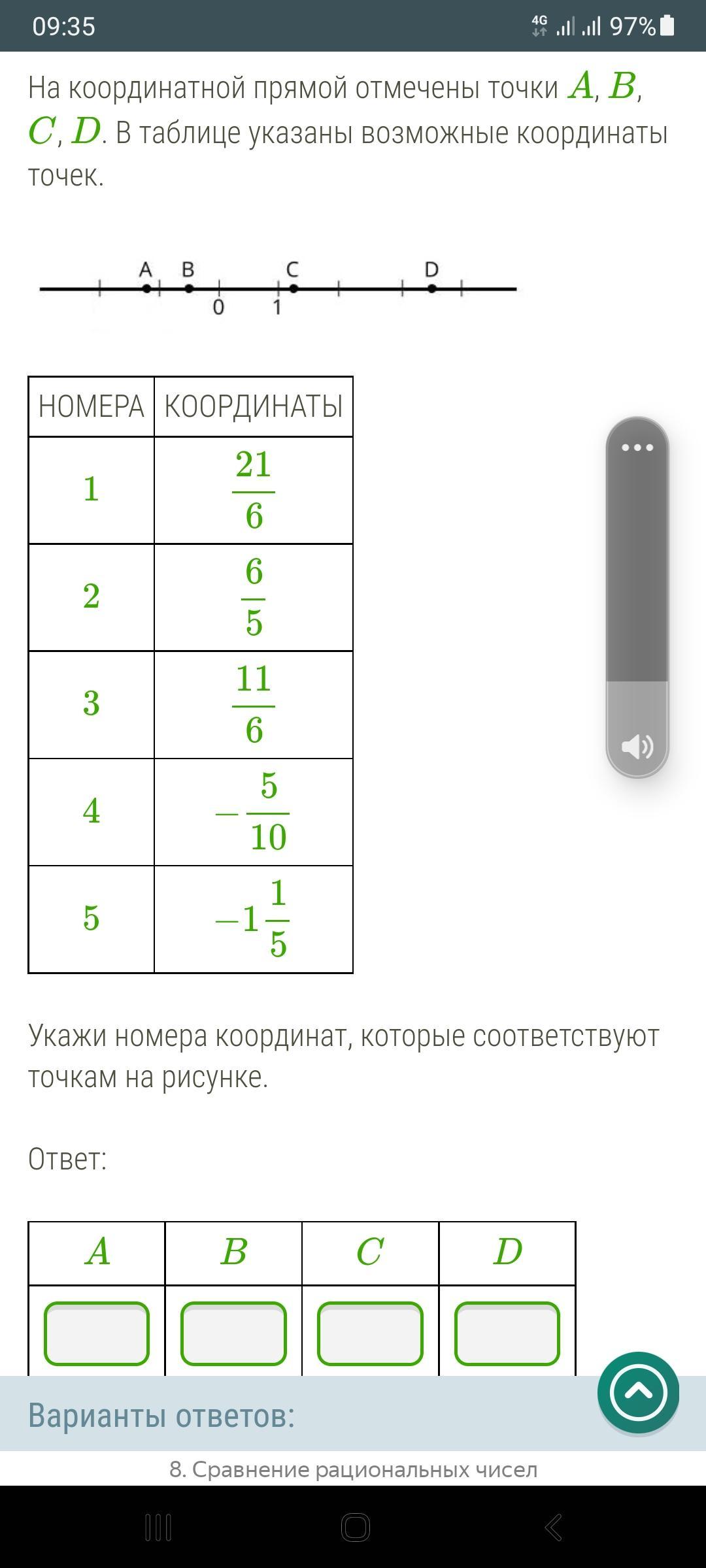 На координатной прямой отмечены точки A, B, C, D. В таблице указаны варианты координат данных точек.