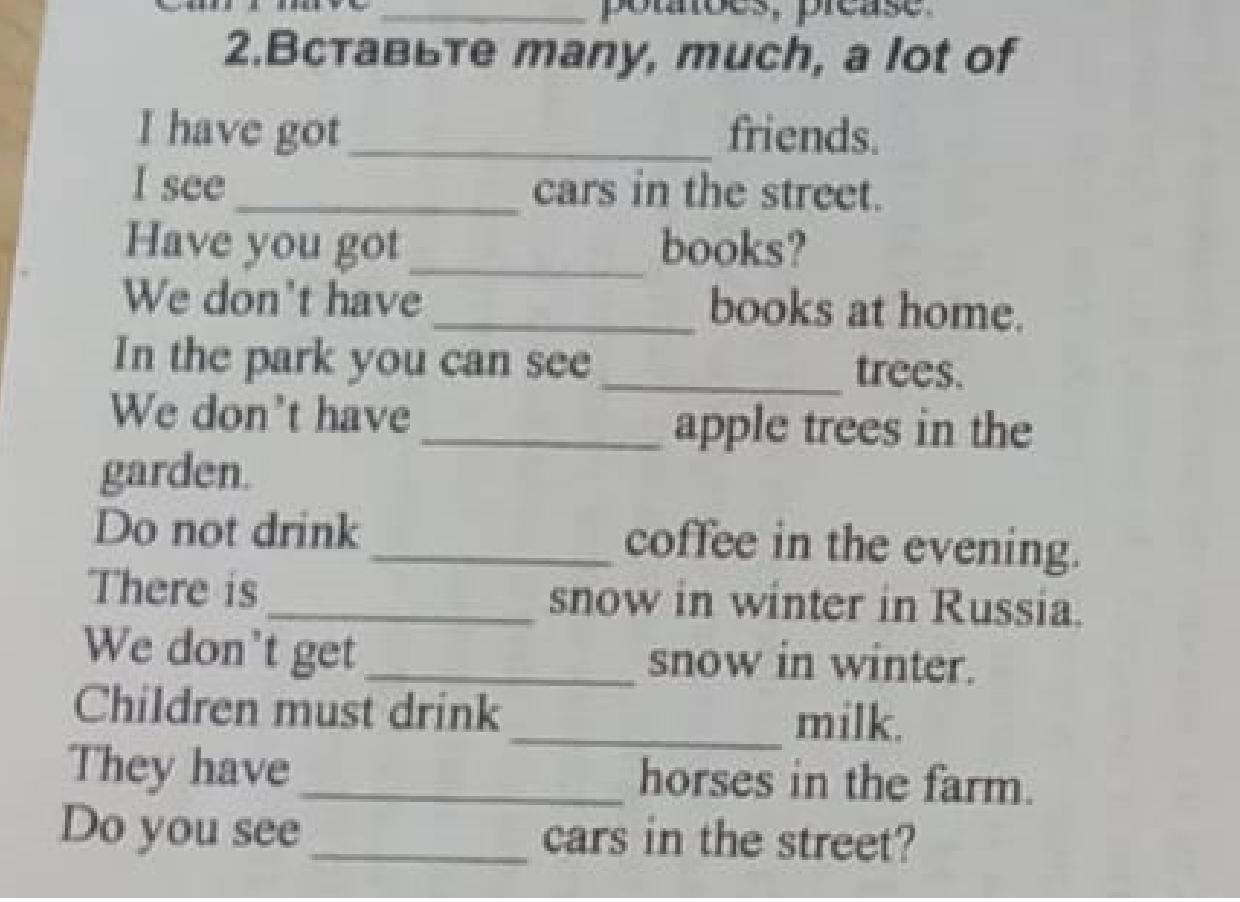 Ответ: 1many 2 a lot of 3many 4 a lot of 5 many 6 a lot of 7 much 8 a lot of 9 much 10 a lot of 11 many 12 many