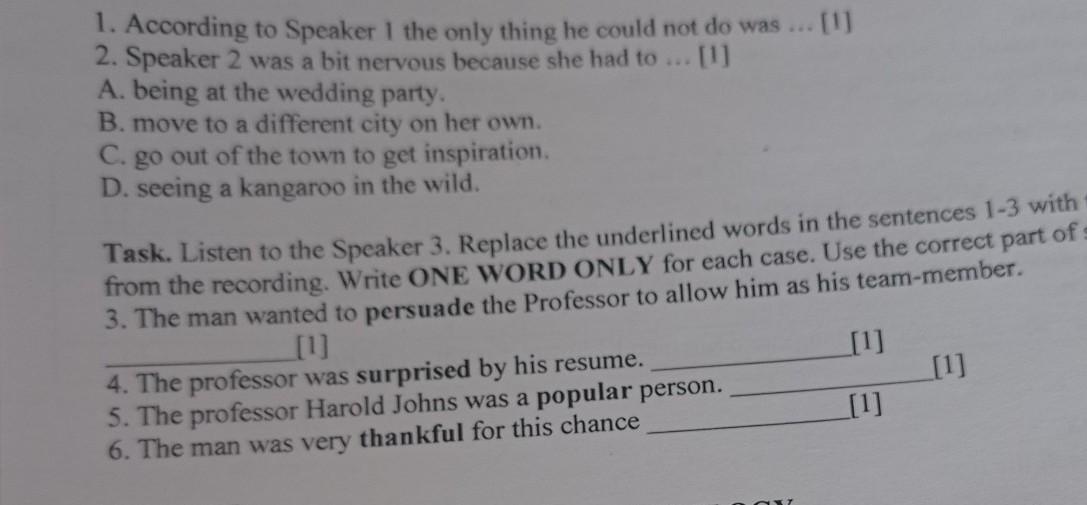 Task. Listen to the Speaker 3: Replace the underlined words in the sentences 1-3 with the words from the recording. Write ONE WORD ONLY for each case. Use the correct part of speech. 3. The man wanted to persuade the Professor to allow him as his team-member. 4. The professor was surprised by his resume. 5. The professor Harold Johns was a popular person. 6. The man was very thankful for this chance