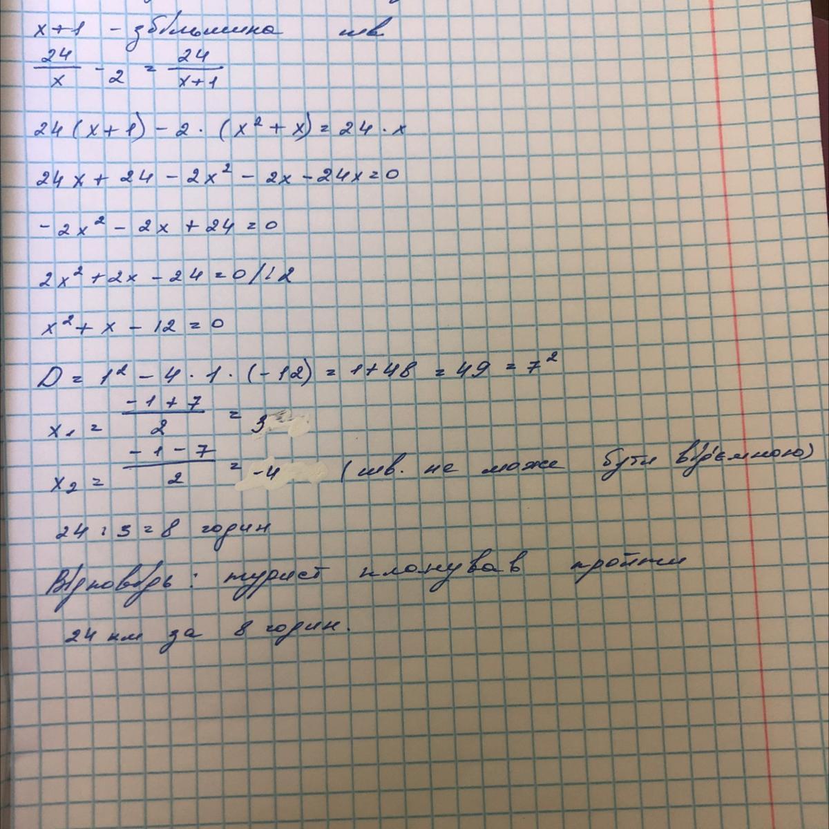 Турист планував пройти 24 км за деякий час. Збільшивши заплано вану швидкість руху на 2 км/год, вiн подолав намічений шлях на 1 год За який час планував ШВИДШе. За турист пройти 24 км?