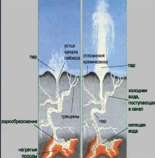 Гейзеры бывают в районах с высокой вулканической активностью.Глубоко в земле есть трещины и пустоты,они постепенно заполняются водой,которая нагревается от расположенного неподалёку вулкана (точнее горячих вулканических пород).Затем когда водяного пара будет много под землёй,произойдёт выброс кипятка и пара под большим давлением на поверхность Земли.