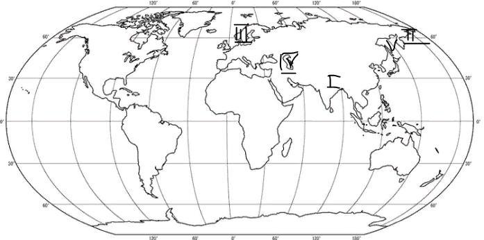 За наведеними назви географічних об’єктів Євразії позначте їх на картосхемі відповідними цифрами. Гімалаї -1; Мис Дежньова -2; Скандинавський півострів – 3; Каспійське море – 4; Жовте море - 5.