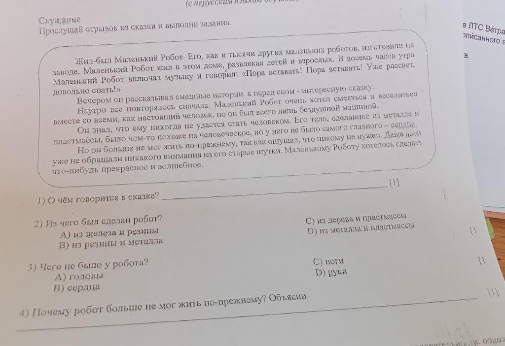 (По Б. / одумай, че го значит 4 гда так гов (с нерусском язы. Сушене Прослушай отрывок из сказки и выполни задания. елтС Вéтра? В чём его от описанного в романе Б. Аку, Посмотр В. отри вмёст Ового тран бсь в Нур- Жил-был Маленький Робот. Его, как и тысячи других маленьких роботов, изготовили на заводе. Маленький Робот жил в этом доме, развлекая детей и взрослых. В восемь часов утра Маленький Робот включал музыку и говорил: «Пора вставать! Пора вставать! Уже рассвет, довольно спать!» Вечером он рассказывал смешные истории, а перед сном - интересную сказку, Наутро все повторялось сначала. Маленький Робот очень хотел смеяться и веселиться вместе со всеми, как настоящий человек, но он был всего лишь бездушной машиной. Он знал, что ему никогда не удастся стать человеком. Его тело, сделанное из металла и пластмассы, было чем-то похоже на человеческое, но у него не было самого главного - серді. Но он больше не мог жить по-прежнему, так как ошғущал, что никому не нужен. Да ли уяже не обращали никакого внимания на его старте шутки. Маленькому Роботу хотелось сделать что-нибудь прекрасное и волшебное. 1) О чём говорится в сказке? 2) Из чего был сделан робот? A) из железа и резины B) из резины и металла С) из дерева и пластмассы D) из металла и пластмассы 11 3) Чего не было у робота? A) головы В) сердца С) ноги D) руки 4) Почему робот больше не мог жить по-прежнему? Объясни. Гоорение напользуя слова последовательск. однажды