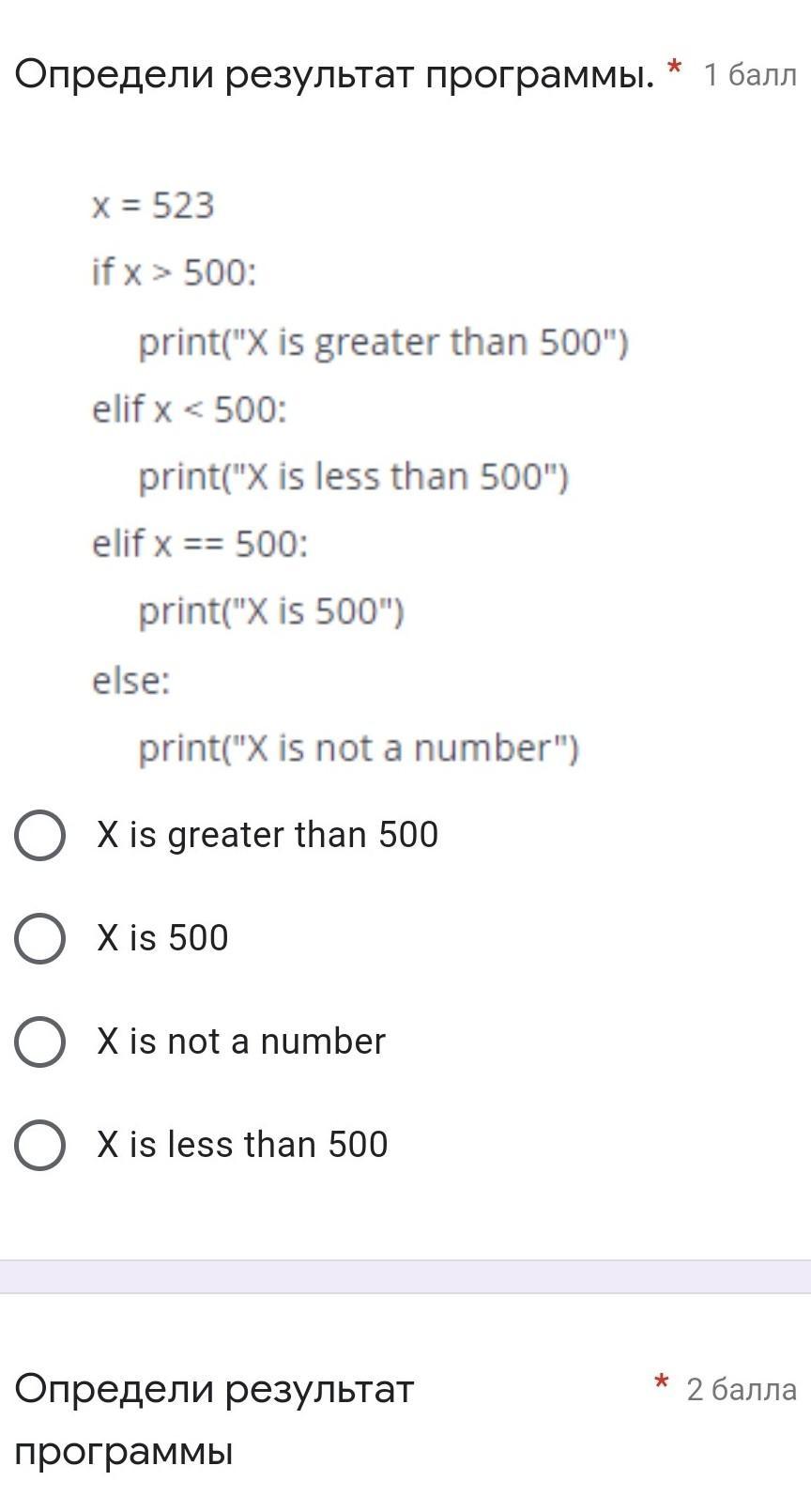 X = 523 if x > 500: print("X is greater than 500") elif x < 500: print("X is less than 500") elif x == 500: print("X is 500") else: print("X is not a number") X is greater than 500 X is 500 X is not a number O X is less than 500