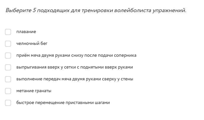Игра в волейбол требует от игрока навыков владения мячом, быстрых перемещений по площадке различными способами (приставными шагами, бегом лицом и спиной вперёд, бегом с резкой сменой направления движения), высоких прыжков. Существует ряд упражнений, которые способствуют развитию этих навыков.