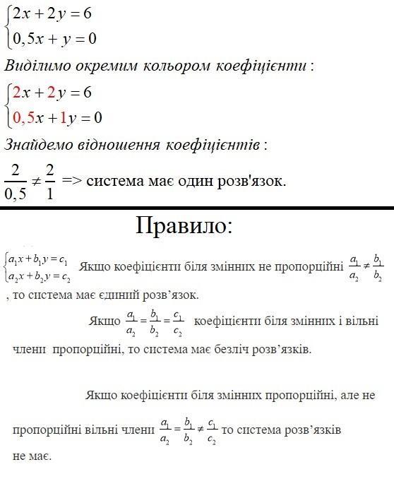 Не розв'язуючи систему, знайдемо кількість розв'язків системи за допомогою коефіцієнтів при відомих членах.