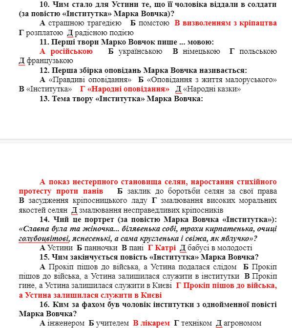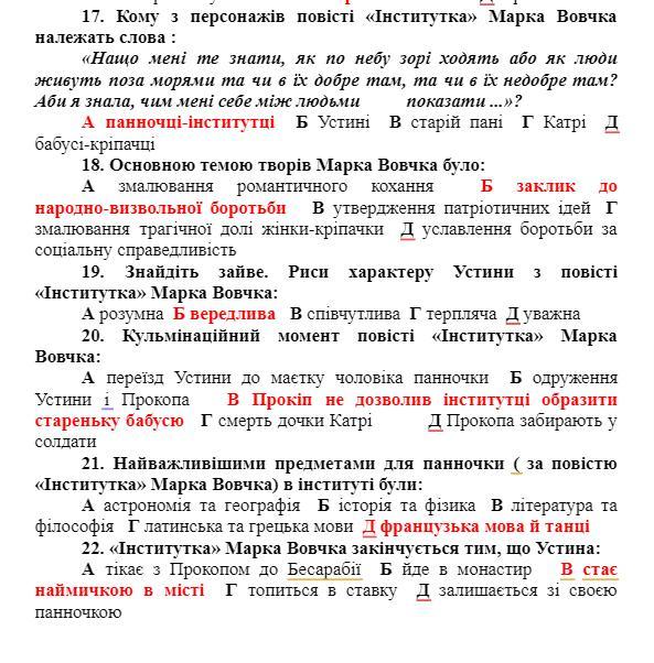 14. Чий це портрет (за повістю Марка Вовчка «Інститутка»): «Славна була та жіночка... білявенька собі, трохи кирпатенька, очиці голубоцвітові, яснесенькі, а сама кругленька і свіжа, як яблучко»?