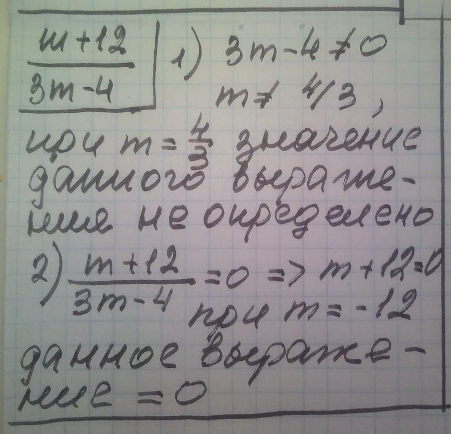 Для следующего алгебраического: m+12/3m-4 а) значение алгебраической дроби при каком значении переменной не определяется? b) при значении переменной алгебраическое значение равно нулю