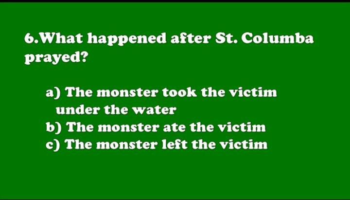 6.What happened after St. Columba prayed? a) The monster took the victim under the water b) The monster ate the victim c) The monster left the victim Срочно Нужно Пожалуста