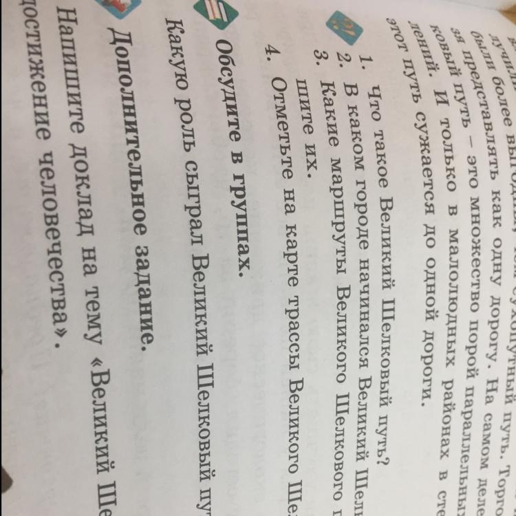 1. Вели́кий шёлковый путь — караванная дорога, связывавшая Восточную Азию со Средиземноморьем в древности и в Средние века. В первую очередь использовался для вывоза шёлка из Китая, с чем и связано его название.
