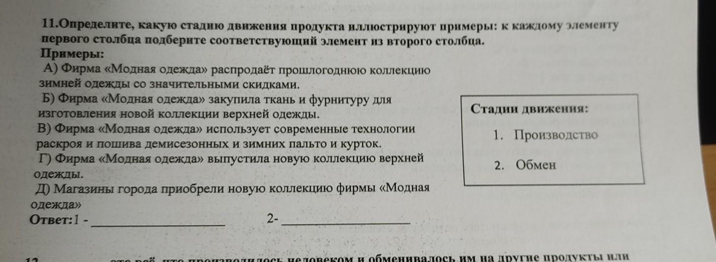 11.Определите, какую стадию движения продукта иллюстрируют примеры: к каждому элементу первого столбца подберите соответствующий элемент из второго столбца. Примеры: