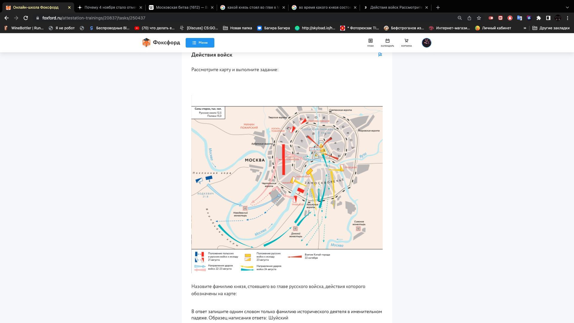 Назовите фамилию князя, стоявшего во главе русского войска, действия которого обозначены на карте: