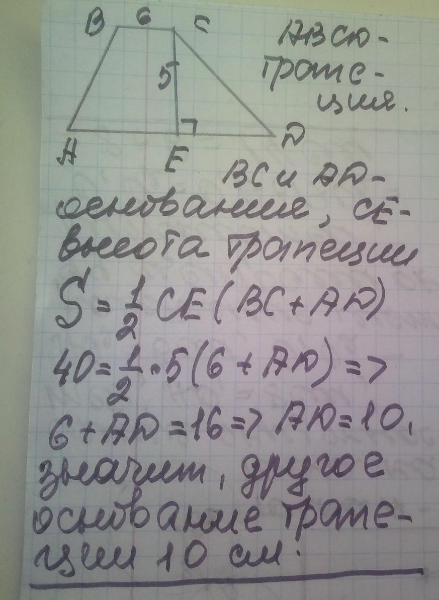 6 см. а висота-5см Знайдіть другу основу трапеції.