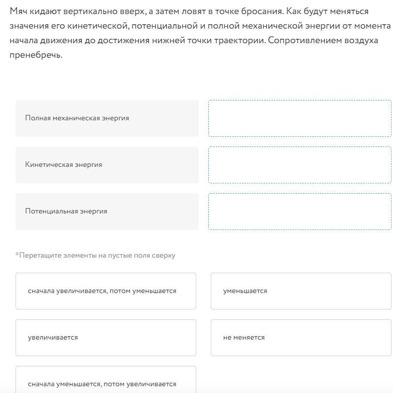 Мяч кидают вертикально вверх, а затем ловят в точке бросания. Как будут меняться значения его кинетической, потенциальной и полной механической энергии от момента начала движения до достижения нижней точки траектории. Сопротивлением воздуха пренебречь.