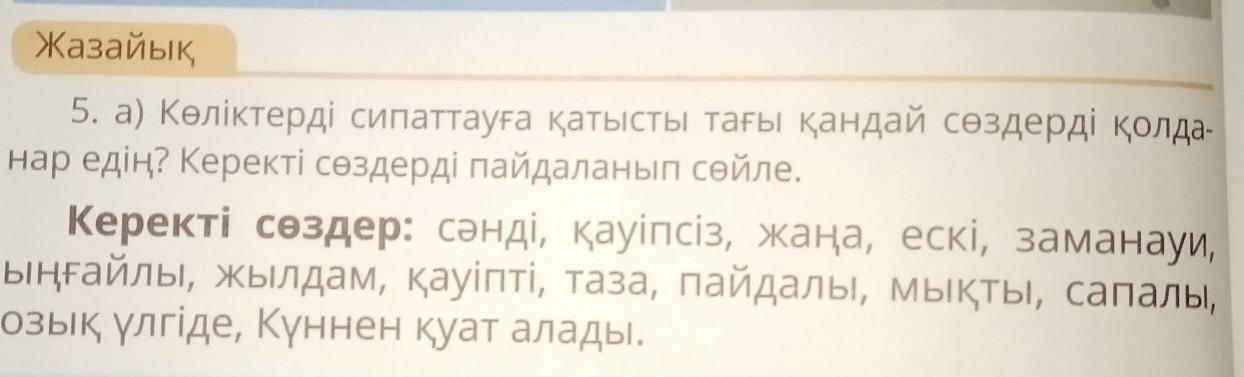 Жазайық 5. а) Көліктерді сипаттауға қатысты тағы қандай сөздерді қолда нар едің? Керекті сөздерді пайдаланып сөйле. Керекті сөздер: сәнді, қауіпсіз, жаңа, ескі, заманауи ыңғайлы, жылдам, қауіпті, таза, пайдалы, мықты, сапалы озық үлгіде, Күннен қуат алады.