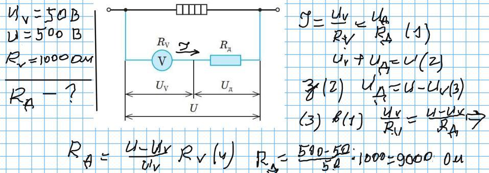 Вкажіть, який додатковий опір необхідно підключити до вольтметра, щоб розширити межі вимірювання від 50 В до 500 В. Опір вольтметра 1000 Ом.