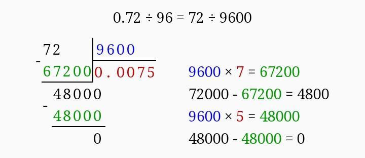 Для удобства вычислений преобразуем делимое и делитель в целые числа. Для этого умножим делимое 0.72 и делитель 96 на 100. В результате наша задача сведется к делению следующих чисел
