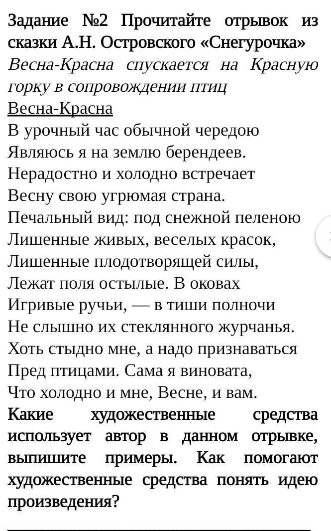 Задание №2 Прочитайте отрывок из сказки А.Н. Островского «Снегурочка» горку в сопровождении птиц Весна-Красна спускается на Красную Весна-Красна В урочный час обычной чередою Являюсь я на землю берендеев. Нерадостно и холодно встречает Весну свою угрюмая страна. Печальный вид: под снежной пеленою ишенные живых, веселых красок, Лишенные плодотворящей силы, Лежат поля остылые. В оковах Хоть стыдно мне, а надо признаваться Пред птицами. Сама я виновата, Что холодно и мне, Весне, и вам. Игривые ручьи, в тиши полночи не слышно их стеклянного журчанья. Какие художественные средства использует автор в данном отрывке, выпишите примеры. Как помогают художественные средства понять идею произведения?