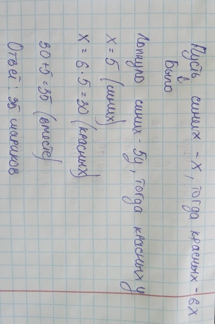 Ваня купил шарики, красных было в 6 раз больше, чем синих. Пока Ваня шёл домой, часть шариков лопнула, причём среди лопнувших шариков красных оказалось в 5 раз меньше, чем синих. Какое наименьшее количество шариков мог купить Ваня?