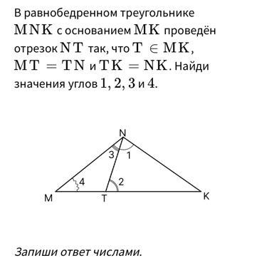 них ∠4 = ∠3 ; ∠4 = ∠К ; ∠1 = ∠2 . Для ΔMNT зовнішній ∠2 = 2 * ∠4 .