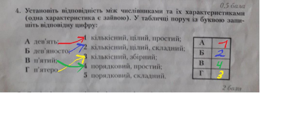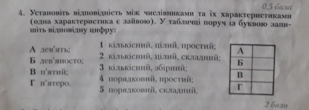 0,5 бала 4. Установіть відповідність між числівниками та їх характеристиками (одна характеристика є зайвою).
