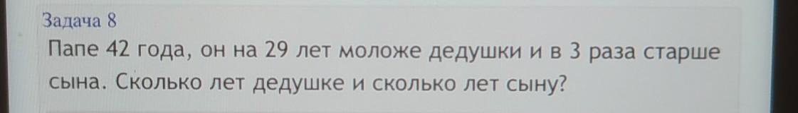 1) 42 + 29 = 71 (год) дедушке;2) 42 : 3 = 14 (лет) сыну.