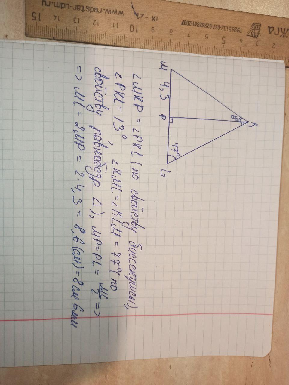 В равнобедренном треугольнике MKL с основанием ML и ∠KLM = 77° проведена биссектриса KP так, что∠MKP=13° , а MP=4 см 3 мм. Определи величину углов PKL и KMP , а также длину стороны ML.