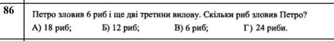 З умови зрозуміло, що 6риб-це 1/3 вилова, тому весь вилов 6*3=18 риб(А).