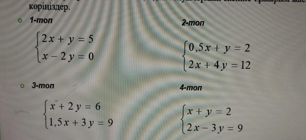 2x + y = 5 x - 2 y = 0 (0,5x + y = 2 2x + 4y = 12 O 3-mon 4-mon x + 2 y = 6 (1,5x + 3y = 9 (x+y=2 ( 2 x – 3y = 9 напишите ответ