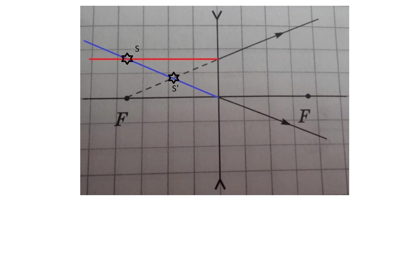 1. Определите положения точечного источника света S и его изображения S' тонкой стеклянной линзе (см. рис.).
