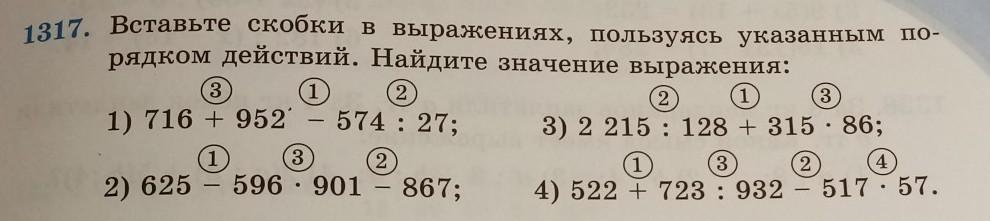1317.Вставьте скобки в выражениях, пользуясь указанным порядком действий. Найдите значение выражения: