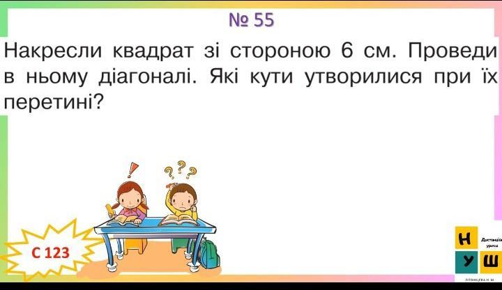 діагоналями квадрата, наскільки я пам‘ятаю, то вони перетинаються під кутом 90°. Отже. Будуть 4 трикутники прямокутні, які рівні і мають кути 45 і 45° і 90°(між діагоналями)