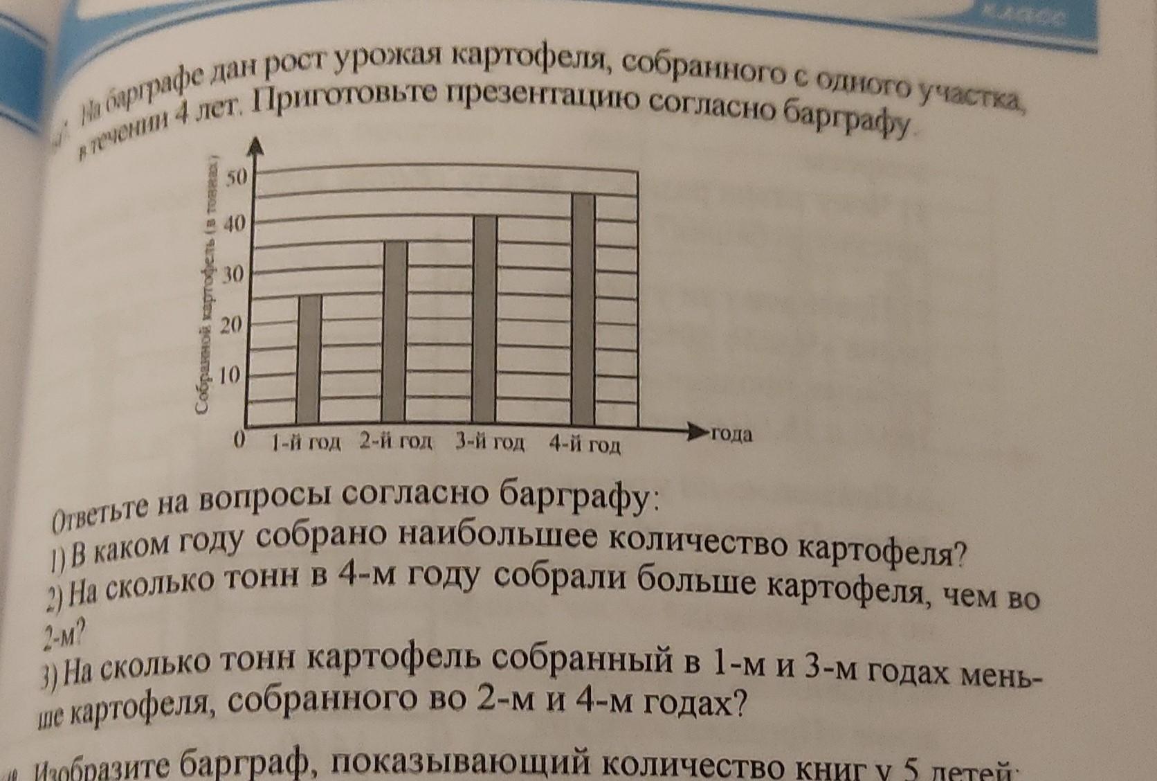 1647. На баргpaфe дан рост урожая картофеля, собранного с одного участка, в течении 4 лет. Приготовьте презентацию согласно барграфу. 50 40 Собранной карrофель (в това 30 20 10 года 1-й год 2-й год 3-й год 4-й год Ответьте на вопросы согласно барграфу: 1) В каком году собрано наибольшее количество картофеля? 2) На сколько тонн в 4-м году собрали больше картофеля, чем во 2-м? 3) На сколько тонн картофель собранный в 1-ми 3-м годах мень- ше картофеля, собранного во 2-ми 4-м годах? показывающий количество книгу 5 детей:
