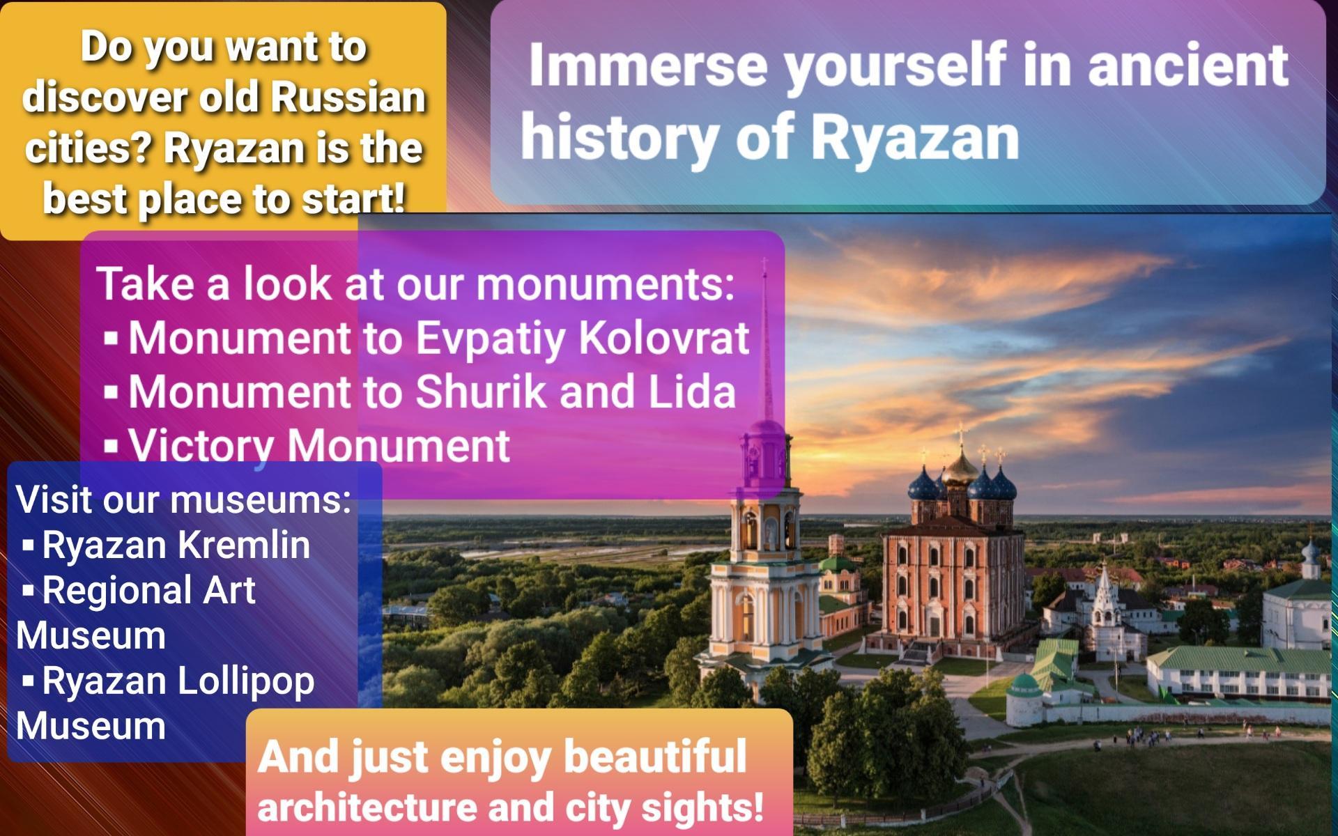 Сделать объявление о Рязани на английском с переводом. Там нужно ещё написать что можно увидеть. Как вот эти.