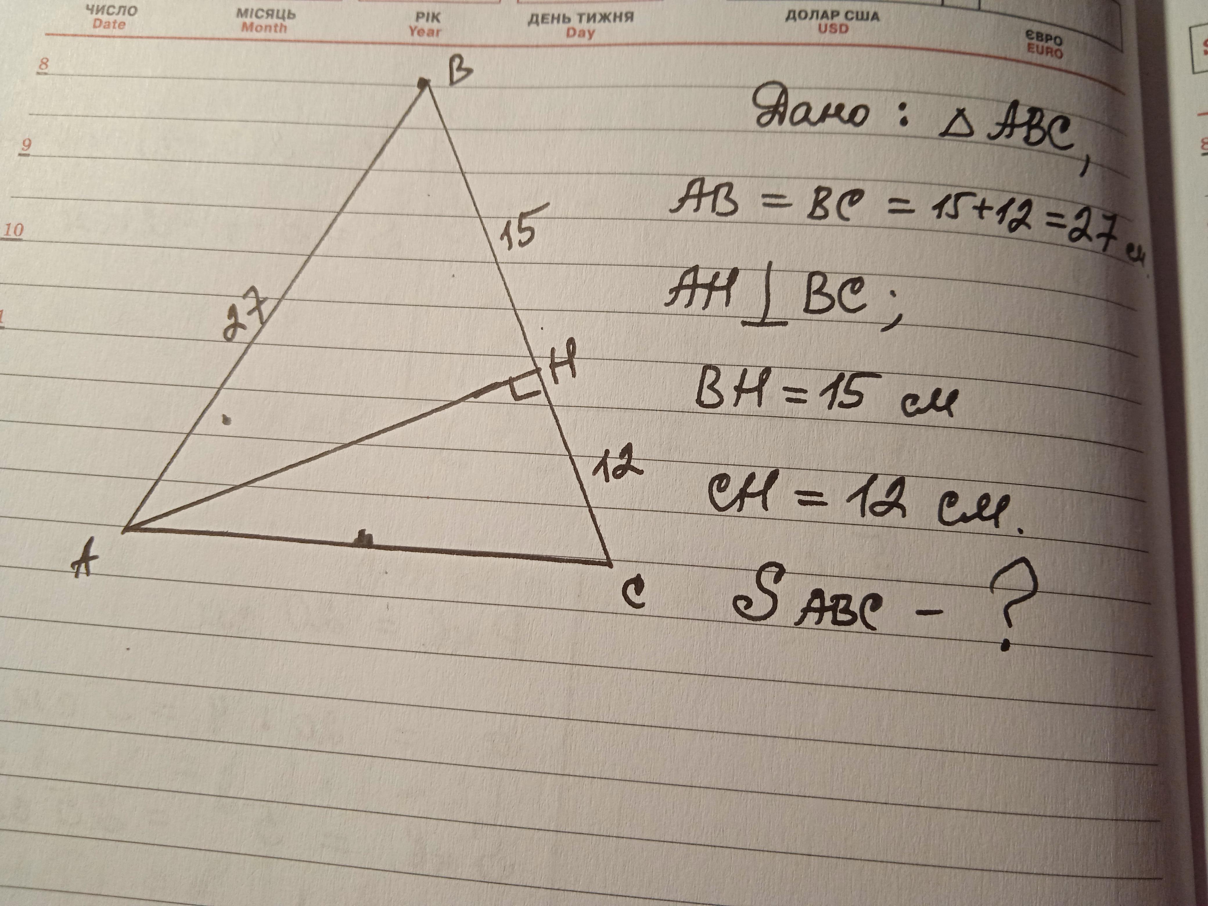 У рівнобедреному трикутнику висота, проведена до бічної сторони, ділить її на відрізки 15см і 12 см, починаючи від вершини кута між бічними сторонами. Знайдіть площу трикутника.