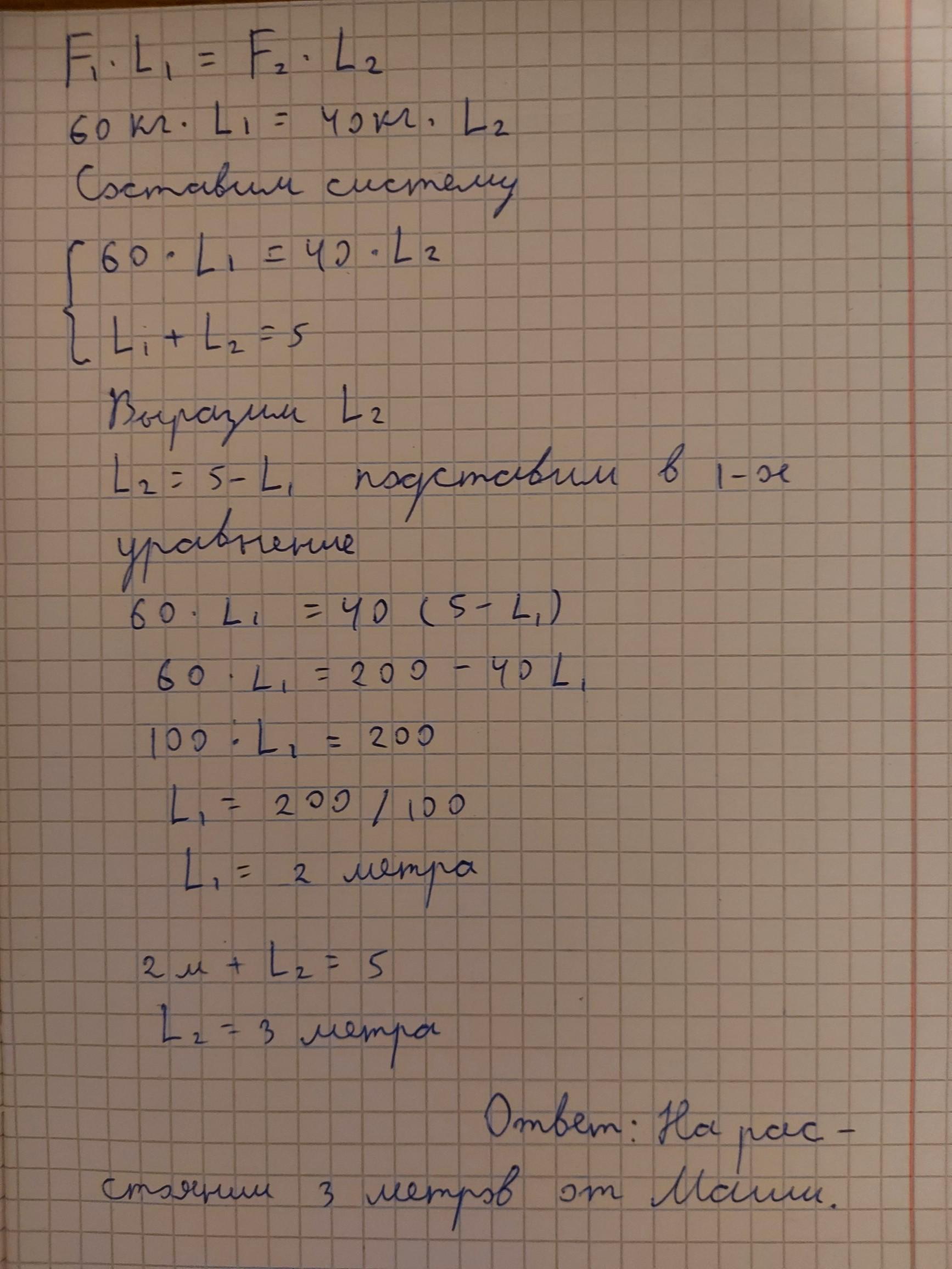 2) Петя и Маша сделали из пятиметровой доски качели. На каком расстоянии от Маши нужно поставить доску на упор, если масса Пети – 60 кг, а Маши - 40 кг?