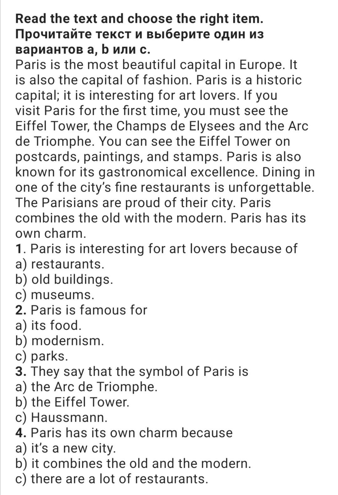 Париж — найкрасивіша столиця Європи. Це також столиця моди. Париж — історична столиця; Місто цікаве для любителів мистецтва. Якщо ви відвідуєте Париж вперше, ви повинні побачити Ейфелеву вежу, Єлисейські поля та Тріумфальну арку. Ви можете побачити Ейфелеву вежу на листівках, картинах і марках. Париж також відомий своєю гастрономічної досконалістю. Пообідати в одному з вишуканих ресторанів міста незабутньо. Парижани пишаються своїм містом. Париж поєднує старе з сучасним. У Парижі є своя чарівність.