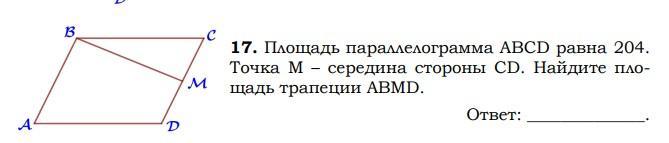 Диагональ параллелограмма делит его на два равных треугольника, поэтому Scbd = 102. Медиана треугольника делит его на два равновеликих треугольника, поэтому Scbm=1/2Scbd = 51