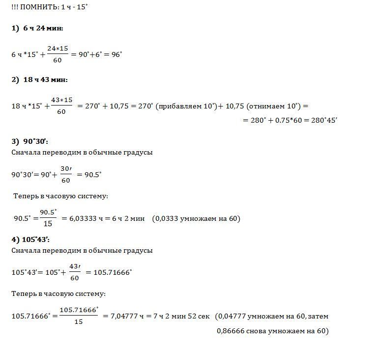 Выразите в градусной мере 6ч24м, 18 ч 43 м
