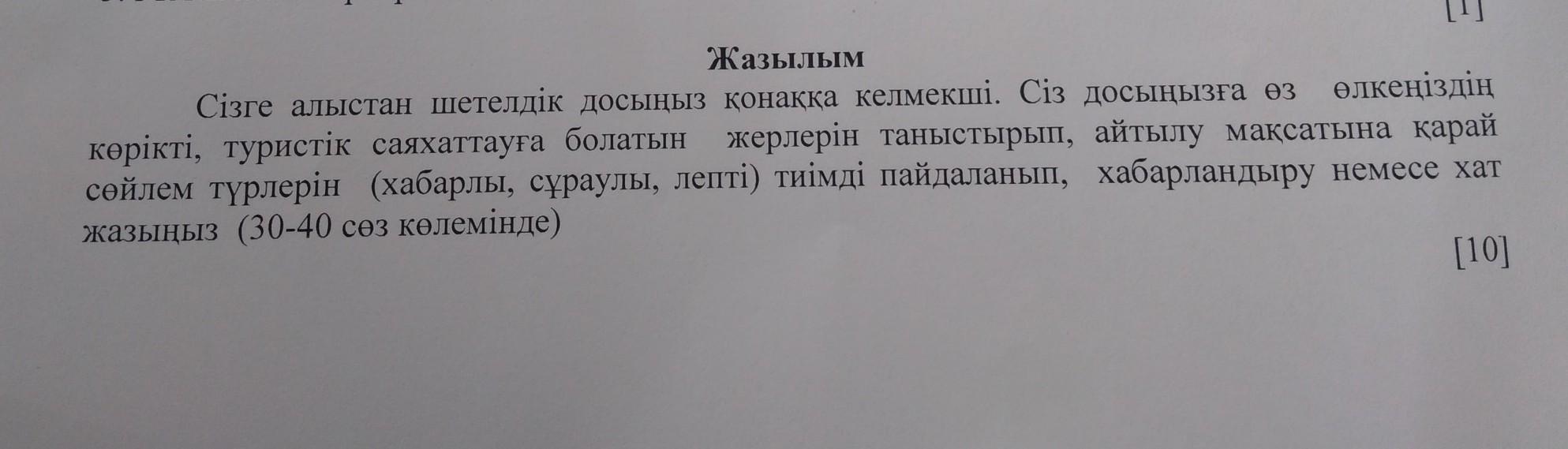 [1] Жазылым Сізге алыстан шетелдік досыңыз қонаққа келмекші. Сіз досыңызға өз өлкеңіздің көрікті, туристік саяхаттауға болатын жерлерін таныстырып, айтылу мақсатына қарай сөйлем түрлерін (хабарлы, сұраулы, лепті) тиімді пайдаланып, хабарландыру немесе хат жазыңыз (30-40 сөз көлемінде) [10] Это Соч